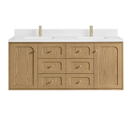 James Martin Vanities Laurent 60" Light Natural Oak Double Vanity With Single Hole 3cm White Zeus Quartz Top and Backsplash