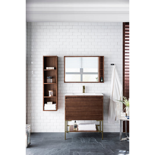 James Martin Vanities Mantova 31.5" Mid-Century Walnut and Champagne Brass Base Single Vanity With Glossy White Composite Stone Top