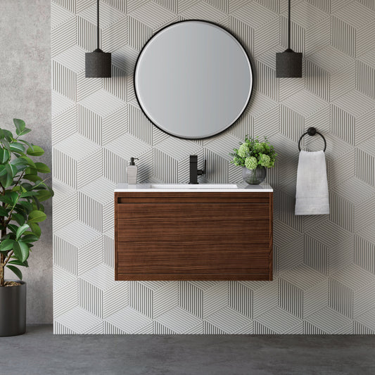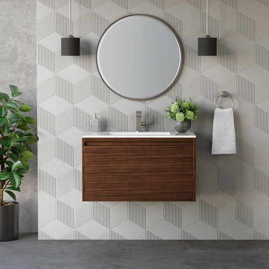 James Martin Vanities Mantova 35.4" Mid-Century Walnut and Brushed Nickel Base Single Vanity With Glossy White Composite Stone Top