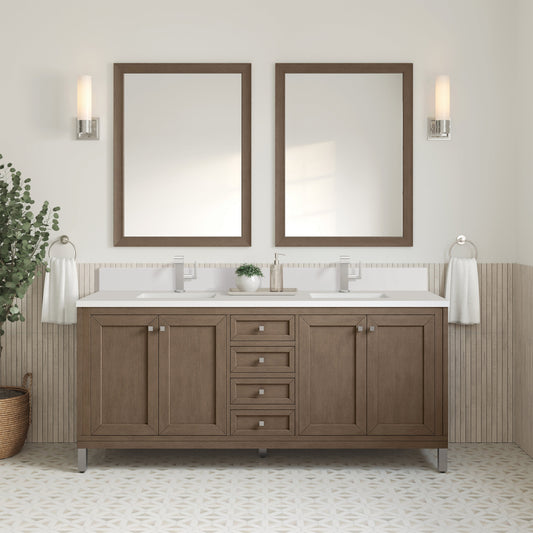 James Martin Vanities Chicago 72" Whitewashed Walnut Double Vanity With Single Hole 3 cm White Zeus Quartz Top & Backsplash