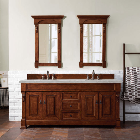 James Martin Vanities Brittany 72" Warm Cherry Double Vanity With Single Hole 3 cm White Zeus Quartz Top & Backsplash