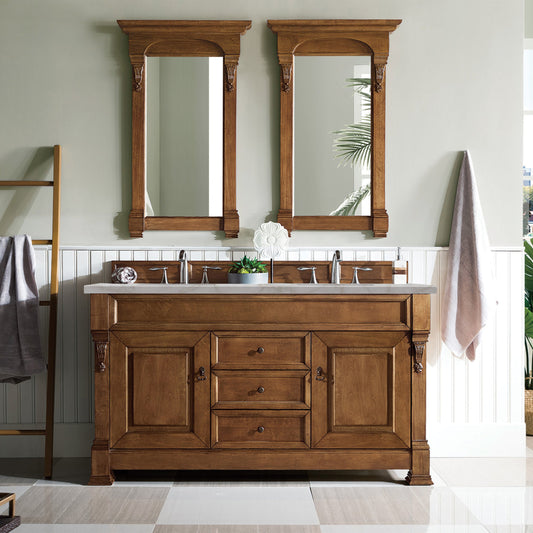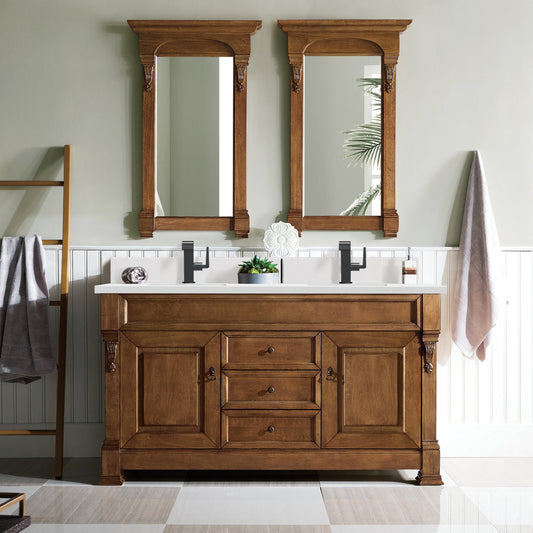 James Martin Vanities Brittany 60" Country Oak Double Vanity With Single Hole 3 cm White Zeus Quartz Top & Backsplash