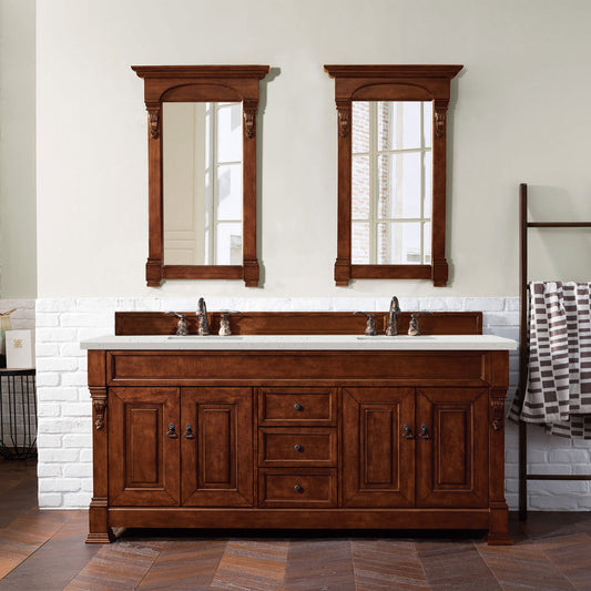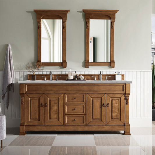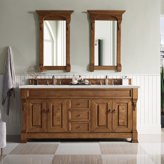 James Martin Vanities Brittany 72" Country Oak Double Vanity With Single Hole 3 cm White Zeus Quartz Top & Backsplash