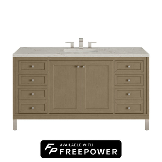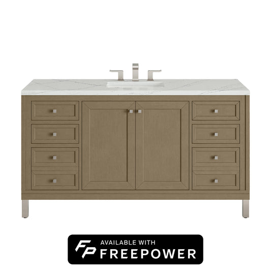 James Martin Vanities Chicago 60" Walnut Whisper Single Vanity With 3cm Eternal Jasmine Pearl Silestone Top With FreePower Wireless Charger