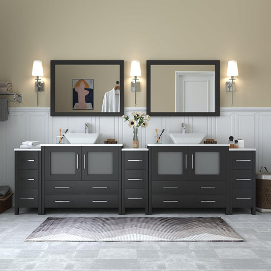 Vanity Art Ravenna 108" Double Espresso Freestanding Vanity Set With White Engineered Marble Top, 2 Ceramic Vessel Sinks, 3 Side Cabinets and 2 Mirrors