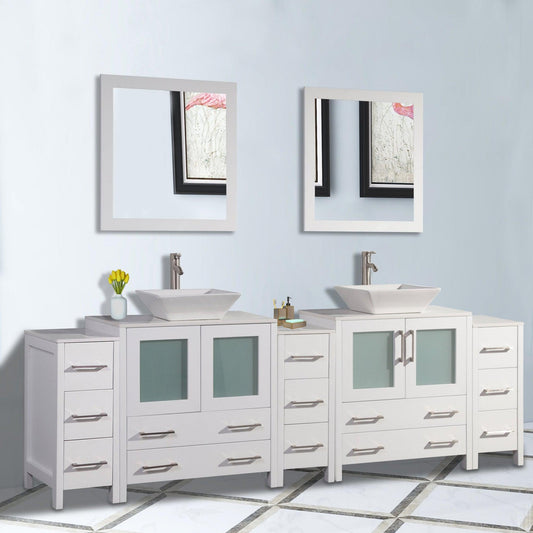 Vanity Art Ravenna 96" Double White Freestanding Vanity Set With White Engineered Marble Top, 2 Ceramic Vessel Sinks, 3 Side Cabinets and 2 Mirrors