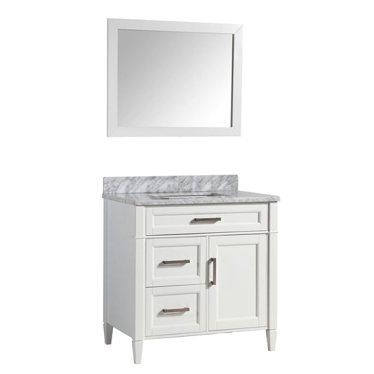 Vanity Art Savona 36" Single White Freestanding Modern Bathroom Vanity Set With Carrara Marble Top, Undermount Ceramic Sink, 3 Dovetail Drawer Cabinet, Backsplash and Mirror