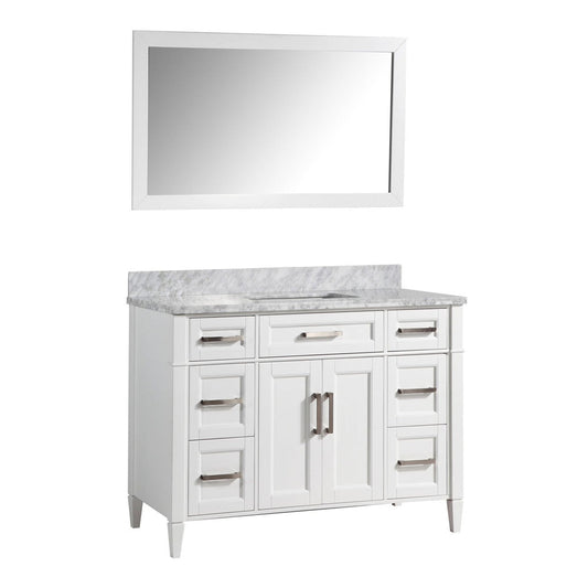 Vanity Art Savona 48" Single White Freestanding Modern Bathroom Vanity Set With Carrara Marble Top, Undermount Ceramic Sink, 7 Dovetail Drawer Cabinet, Backsplash and Mirror
