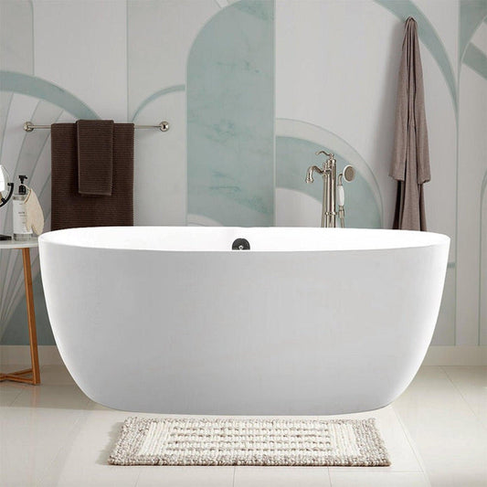Vanity Art 59" x 22" White Acrylic Freestanding Contemporary Design Soaking Bathtub With Brushed Nickel Slotted Overflow & Pop-up Drain