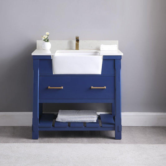 Altair Georgia 36" Single Jewelry Blue Freestanding Bathroom Vanity Set With Aosta White Composite Stone Top, Rectangular Farmhouse Sink, Overflow, and Backsplash