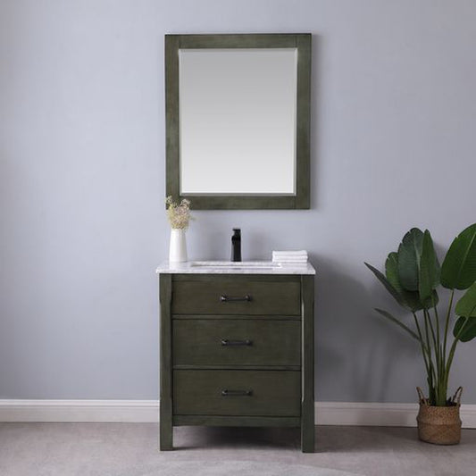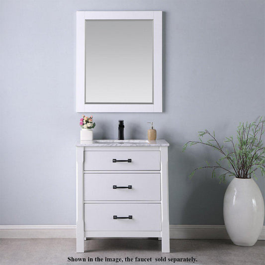 Altair Maribella 30" Single White Freestanding Bathroom Vanity Set With Mirror, Natural Carrara White Marble Top, Rectangular Undermount Ceramic Sink, and Overflow