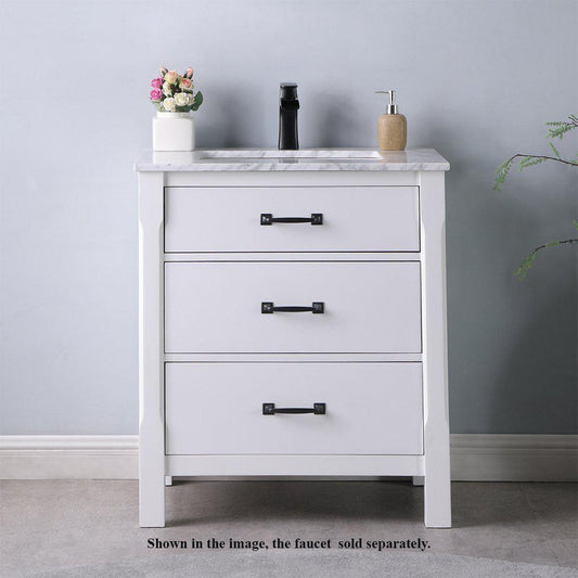 Altair Maribella 30" Single White Freestanding Bathroom Vanity Set With Natural Carrara White Marble Top, Rectangular Undermount Ceramic Sink, and Overflow