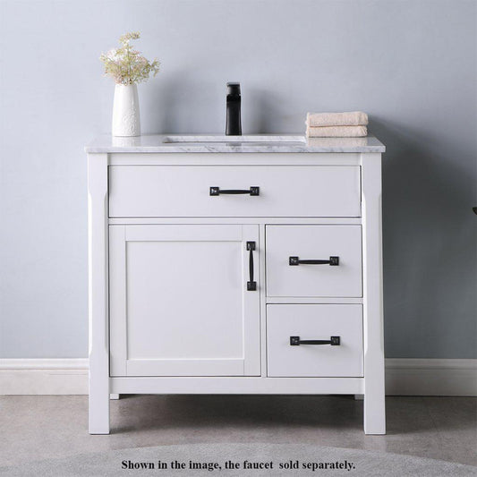 Altair Maribella 36" Single White Freestanding Bathroom Vanity Set With Natural Carrara White Marble Top, Rectangular Undermount Ceramic Sink, and Overflow