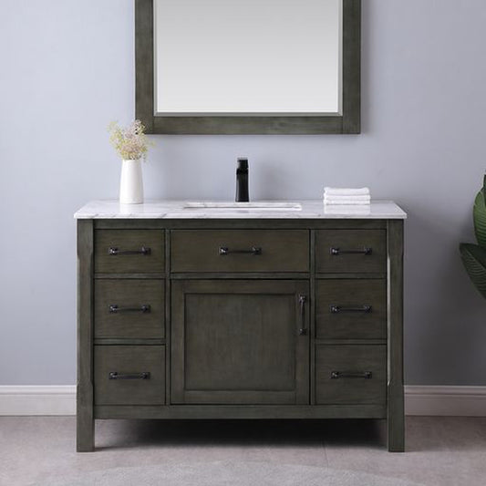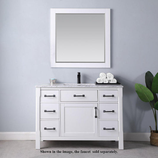 Altair Maribella 48" Single White Freestanding Bathroom Vanity Set With Mirror, Natural Carrara White Marble Top, Rectangular Undermount Ceramic Sink, and Overflow