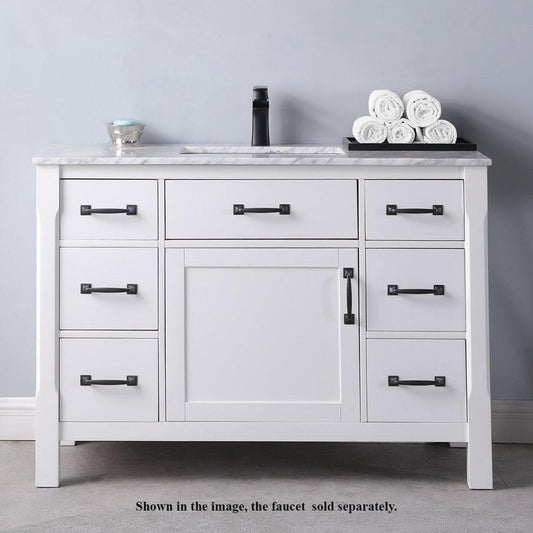 Altair Maribella 48" Single White Freestanding Bathroom Vanity Set With Natural Carrara White Marble Top, Rectangular Undermount Ceramic Sink, and Overflow