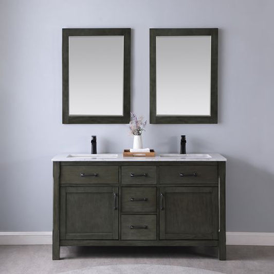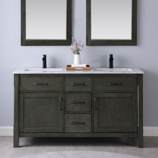 Altair Maribella 60" Double Rust Black Freestanding Bathroom Vanity Set With Mirror, Natural Carrara White Marble Top, Rectangular Undermount Ceramic Sink, and Overflow
