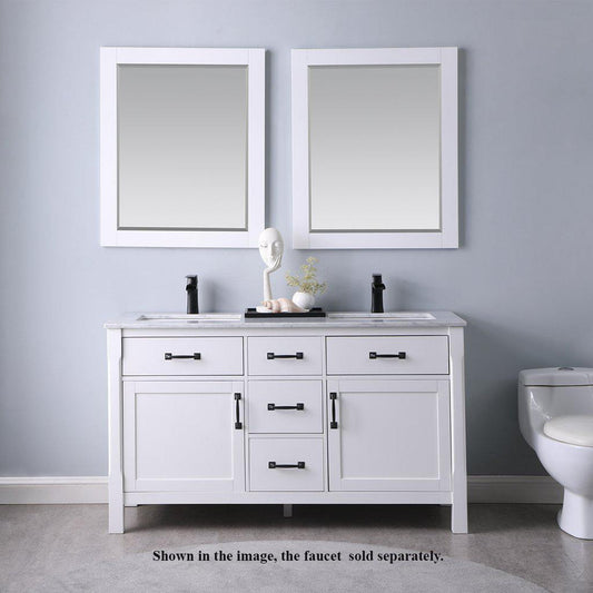 Altair Maribella 60" Double White Freestanding Bathroom Vanity Set With Mirror, Natural Carrara White Marble Top, Rectangular Undermount Ceramic Sink, and Overflow