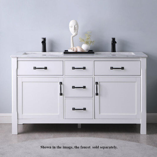 Altair Maribella 60" Double White Freestanding Bathroom Vanity Set With Natural Carrara White Marble Top, Rectangular Undermount Ceramic Sink, and Overflow