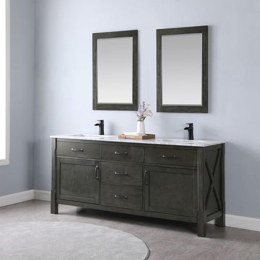 Altair Maribella 72" Double White Freestanding Bathroom Vanity Set With Mirror, Natural Carrara White Marble Top, Two Rectangular Undermount Ceramic Sinks, and Overflow
