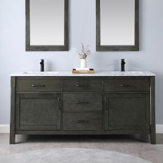Altair Maribella 72" Double Rust Black Freestanding Bathroom Vanity Set With Mirror, Natural Carrara White Marble Top, Two Rectangular Undermount Ceramic Sinks, and Overflow