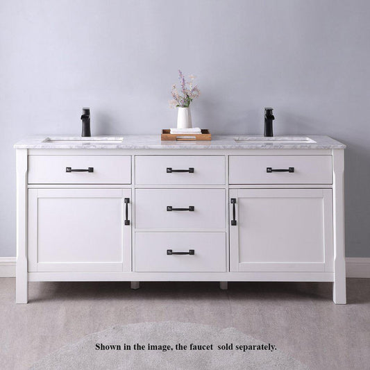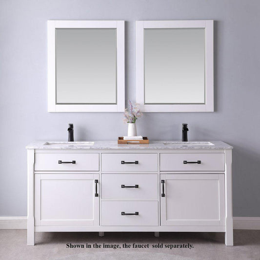Altair Maribella 72" Double White Freestanding Bathroom Vanity Set With Natural Carrara White Marble Top, Two Rectangular Undermount Ceramic Sinks, and Overflow