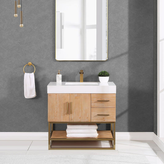 Altair Bianco 36" Light Brown Freestanding Single Bathroom Vanity Set With Brushed Gold Support Base, White Composite Stone Top, Single Rectangular Undermount Ceramic Sink, and Overflow