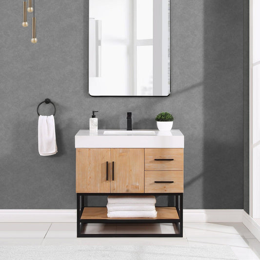 Altair Bianco 36" Light Brown Freestanding Single Bathroom Vanity Set With Matte Black Support Base, White Composite Stone Top, Single Rectangular Undermount Ceramic Sink, and Overflow