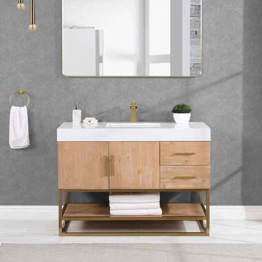 Altair Bianco 48" Light Brown Freestanding Single Bathroom Vanity Set With Brushed Gold Support Base, White Composite Stone Top, Single Rectangular Undermount Ceramic Sink, and Overflow