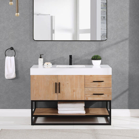 Altair Bianco 48" Light Brown Freestanding Single Bathroom Vanity Set With Matte Black Support Base, White Composite Stone Top, Single Rectangular Undermount Ceramic Sink, and Overflow