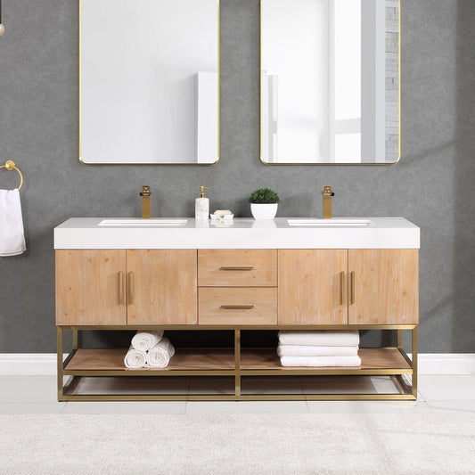 Altair Bianco 72" Light Brown Freestanding Double Bathroom Vanity Set With Brushed Gold Support Base, White Composite Stone Top, Two Rectangular Undermount Ceramic Sinks, and Overflow