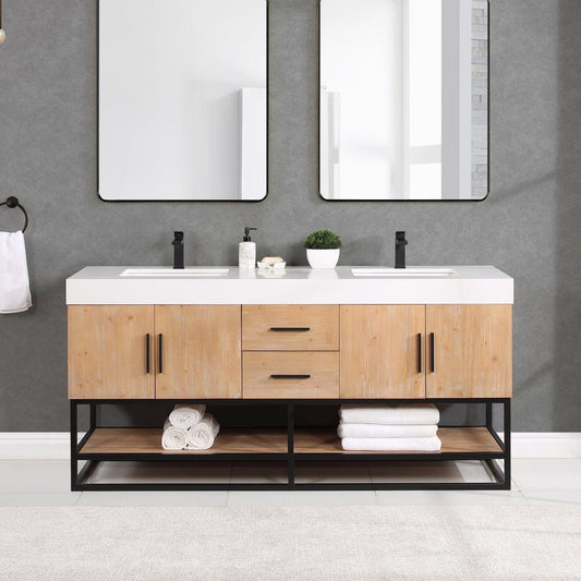 Altair Bianco 72" Light Brown Freestanding Double Bathroom Vanity Set With Matte Black Support Base, White Composite Stone Top, Two Rectangular Undermount Ceramic Sinks, and Overflow