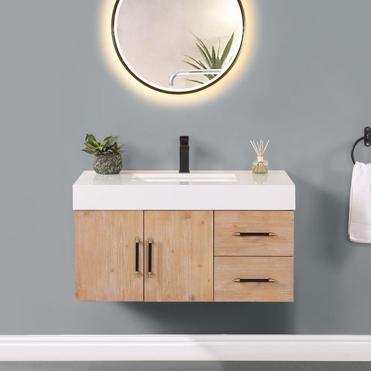 Altair Corchia 36" Light Brown Wall-Mounted Single Bathroom Vanity Set With White Composite Stone Top, Single Rectangular Undermount Ceramic Sink, and Overflow
