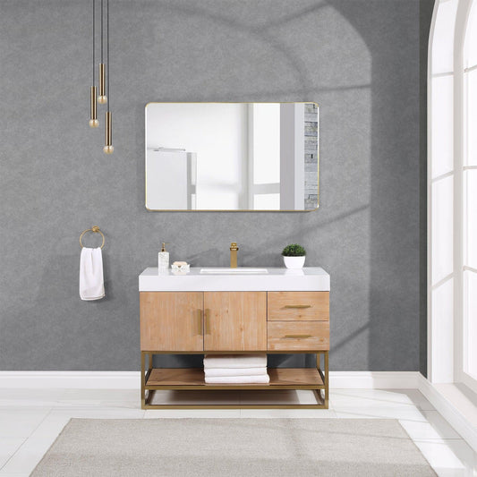 Altair Bianco 48" Light Brown Freestanding Single Bathroom Vanity Set With Brushed Gold Support Base, Mirror, White Composite Stone Top, Single Rectangular Undermount Ceramic Sink, and Overflow