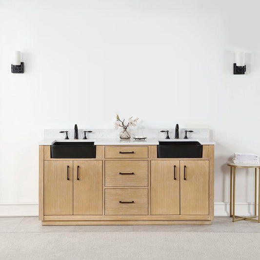 Altair Novago 72" Weathered Pine Freestanding Double Bathroom Vanity Set With Aosta White Composite Stone Top, Double Rectangular Drop-In Black Farmhouse Ceramic Sinks, Overflow, and Backsplash