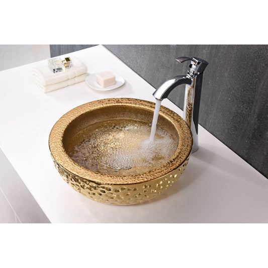 ANZZI Levi Series 17" x 17" Round Speckled Gold Deco-Glass Vessel Sink With Polished Chrome Pop-Up Drain