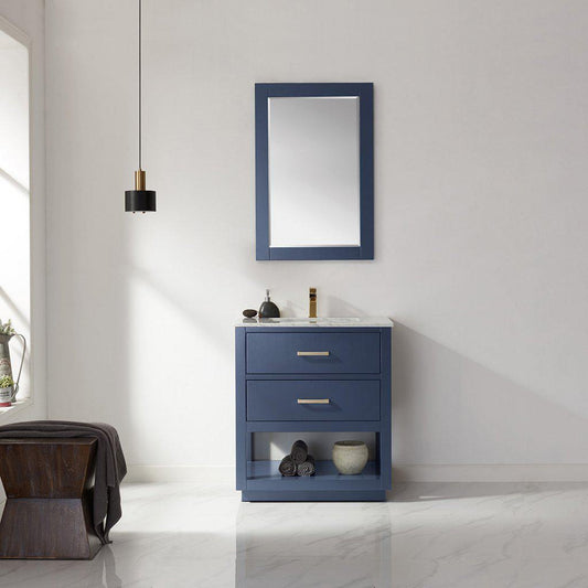 Altair Remi 30" Single Royal Blue Freestanding Bathroom Vanity Set With Mirror, Natural Carrara White Marble Top, Rectangular Undermount Ceramic Sink, and Overflow
