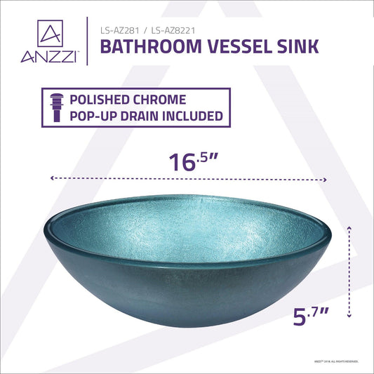 ANZZI Posh Series 17" x 17" Round Coral Blue Deco-Glass Vessel Sink With Polished Chrome Pop-Up Drain