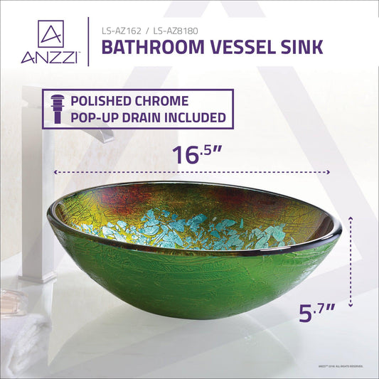ANZZI Tara Series 17" x 17" Round Emerald Burst Deco-GlassVessel Sink With Polished Chrome Pop-Up Drain