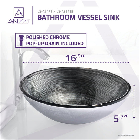 ANZZI Tara Series 17" x 17" Round Platinum Storm Deco-Glass Vessel Sink With Polished Chrome Pop-Up Drain