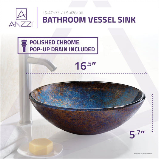 ANZZI Tara Series 17" x 17" Round Sapphire Burst Deco-Glass Vessel Sink With Polished Chrome Pop-Up Drain