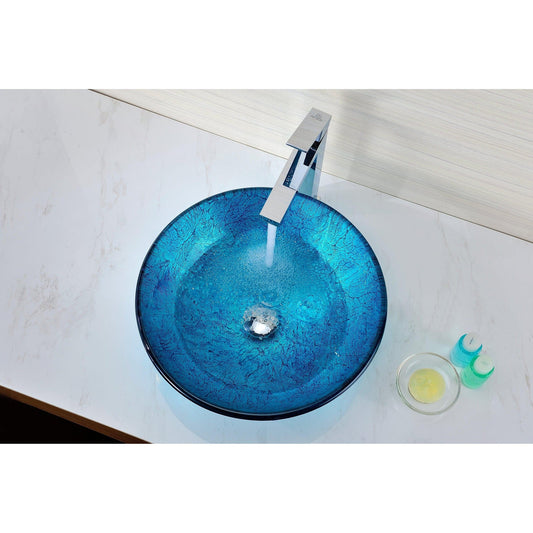 ANZZI Tereali Series 17" x 17" Round Blue Ice Deco-Glass Vessel Sink With Polished Chrome Pop-Up Drain
