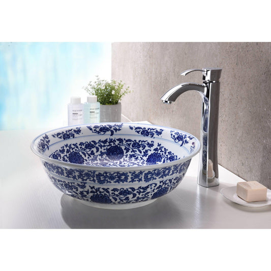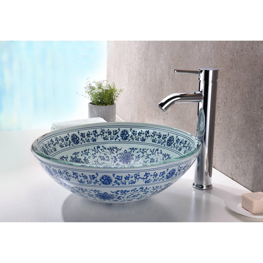 ANZZI Cadence Series 16" x 16" Round White and Blue Floral Deco-Glass Vessel Sink With Polished Chrome Pop-Up Drain