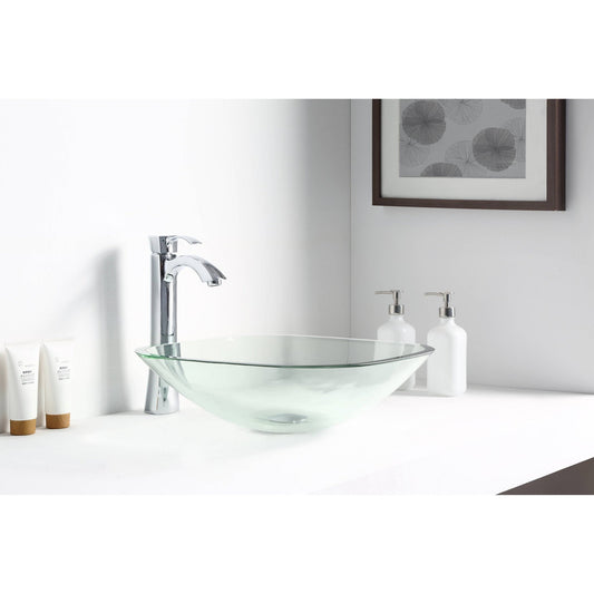 ANZZI Cadenza Series 17" x 17" Square Shape Lustrous Clear Deco-Glass Vessel Sink With Chrome Pop-Up Drain and Enti Faucet