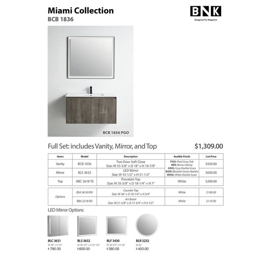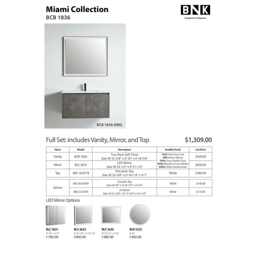 BNK BCB1836GMG Miami Grey Mable Grain Vanity Only Two-Door Soft Close