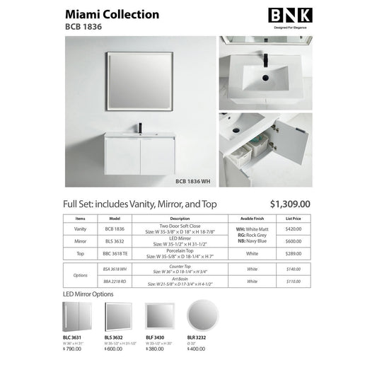 BNK BCB1836WH Miami White Matt Vanity Only Two-Door Soft Close
