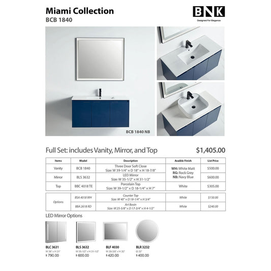 BNK BCB1840NB Miami Navy Blue Vanity Only Three-Door Soft Close