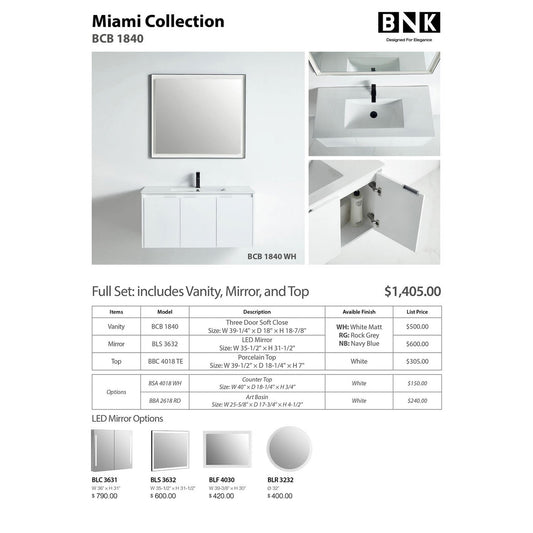 BNK BCB1840WH Miami White Matt Vanity Only Three-Door Soft Close