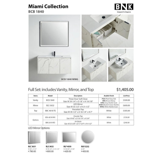 BNK BCB1840WMG Miami White Mable Grain Vanity Only Three-Door Soft Close