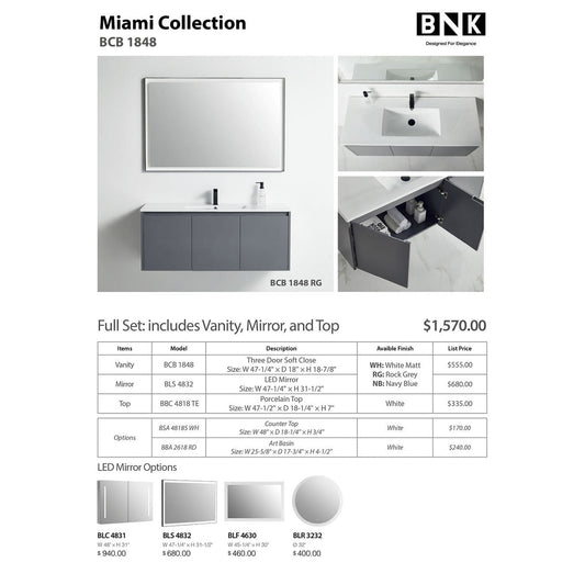 BNK BCB1848RG Miami Rock Grey Vanity Only Three-Door Soft Close