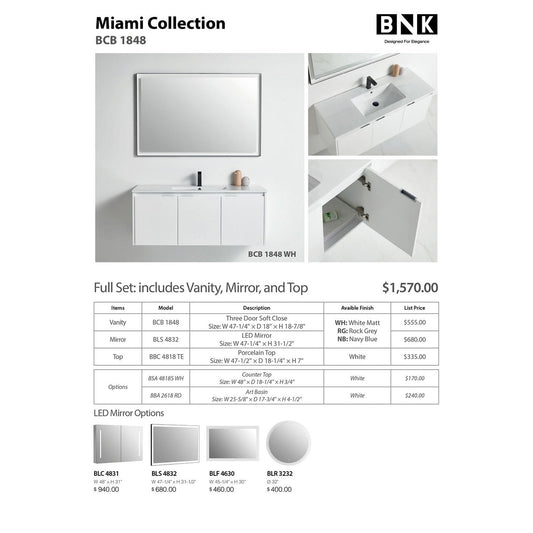 BNK BCB1848WH Miami White Matt Vanity Only Three-Door Soft Close